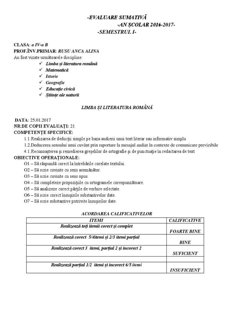 Fisa Evaluare Sumativa Pentru Clasa A 2 A La Limba Romana Cu Descriptori De Performanta Sheet Music Music