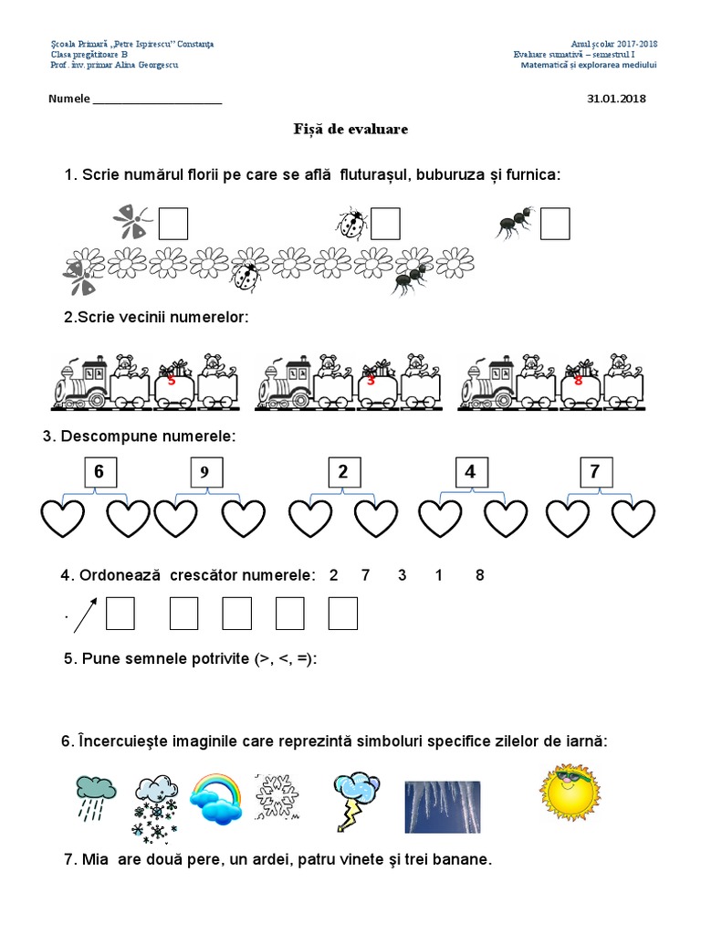 Fise De Lucru Gradinita Fisa De Evaluare Semestrul 1 Clasa 1 Mem Matematica
