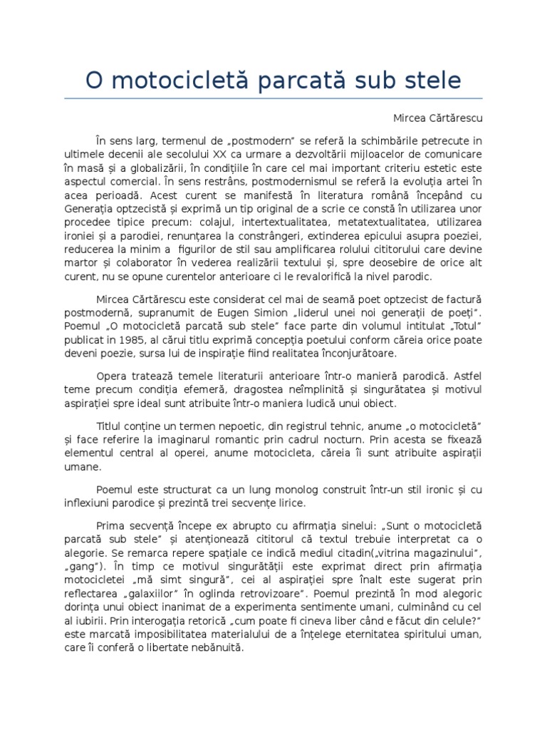 O Motocicleta Parcata Sub Stele De Mircea Cartarescu Liceunet Ro