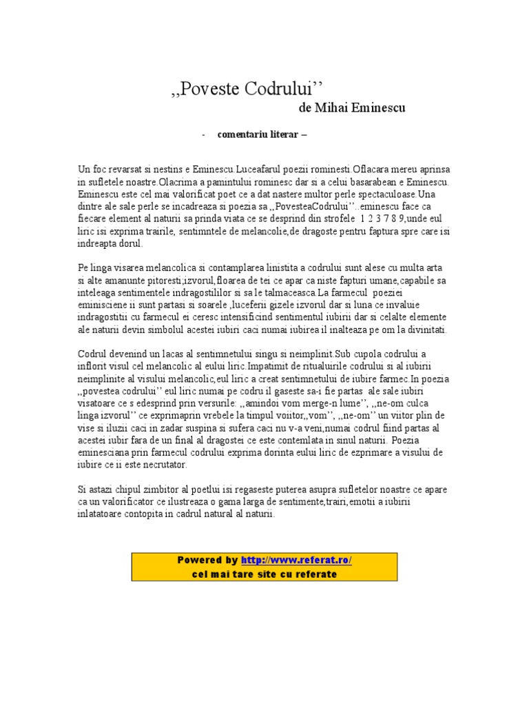 Povestea Codrului De Mihai Eminescu Anideșcoală Ro