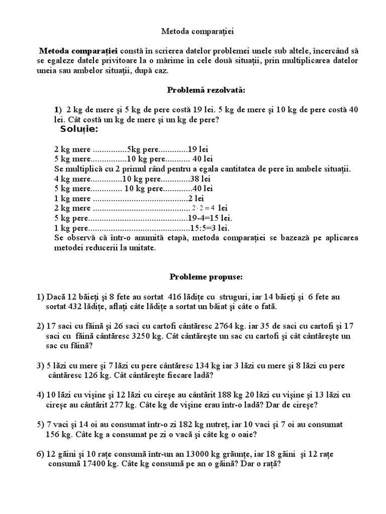 Probleme Care Se Rezolva Prin Metoda Comparatiei Clasa 4