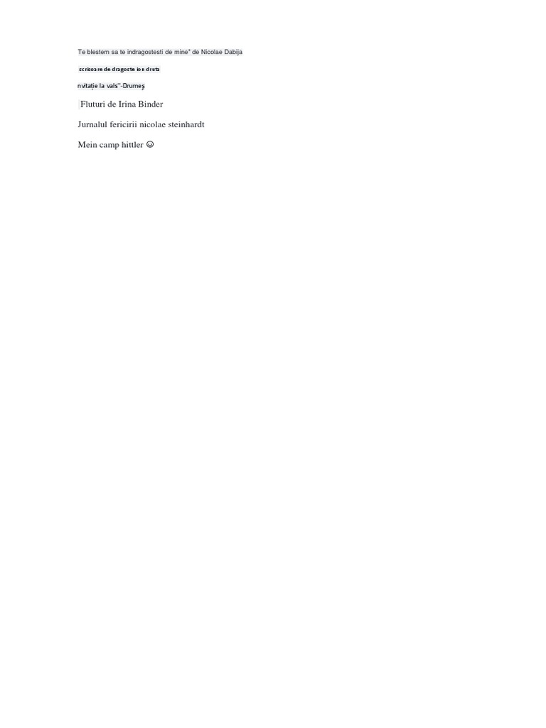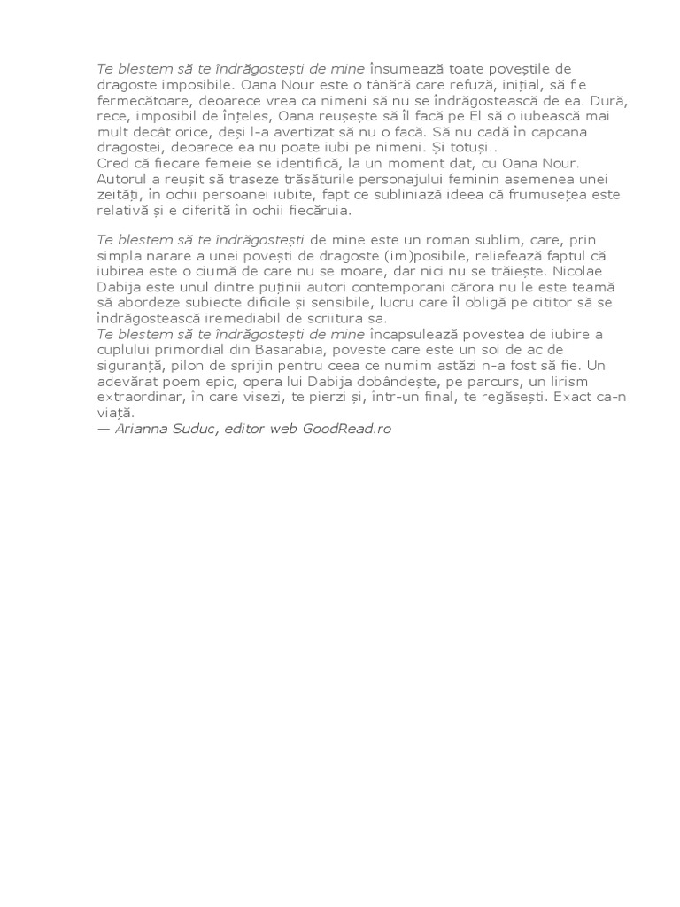 Te blestem sa te indragostesti de mine pdf. Te blestem sa te îndrăgostești de mine am aflat de această carte inca de anul trecut. Download by nicolae dabija o colec ie de pove ti intense de dragoste f r final ferici. Nu m am încumetat anul trecut sa dau banii pe ea iar in februarie nu m am mai abținut. Mult de tot și ai putea face totul pentru mine.