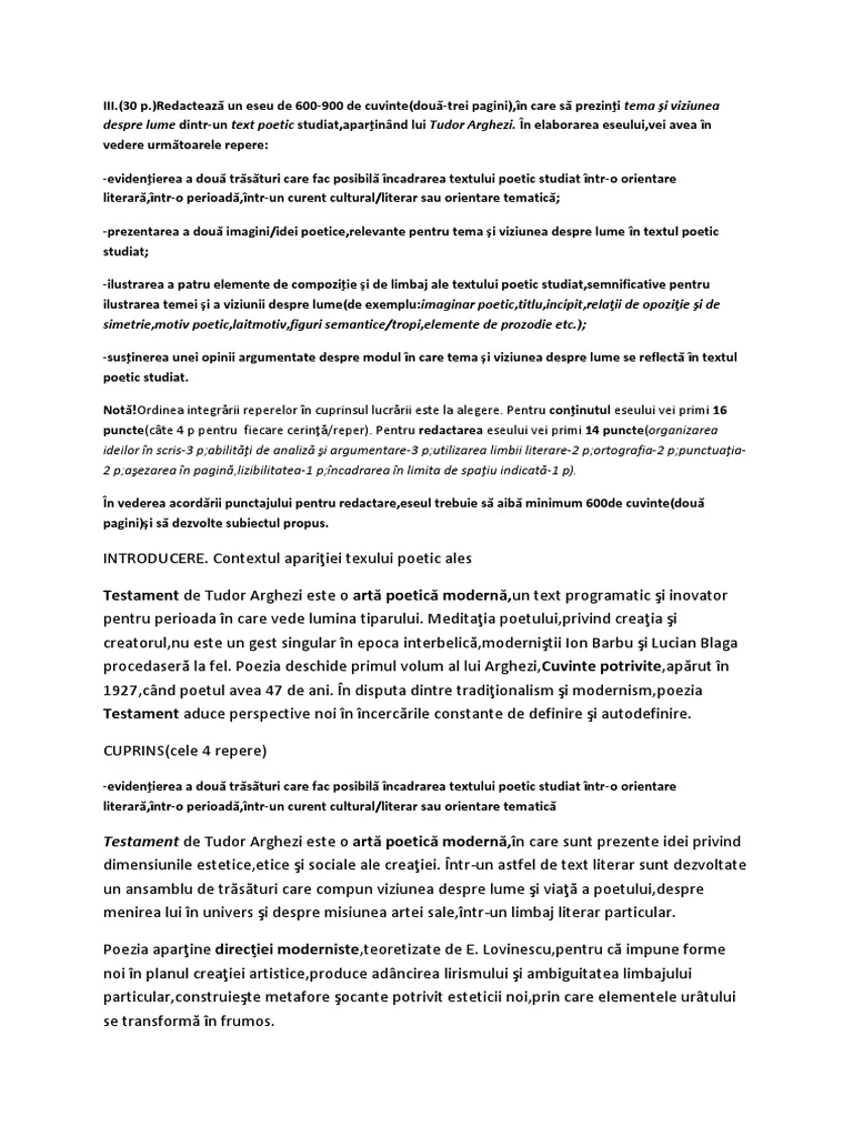 Eseu Bac Testament De Tudor Arghezi